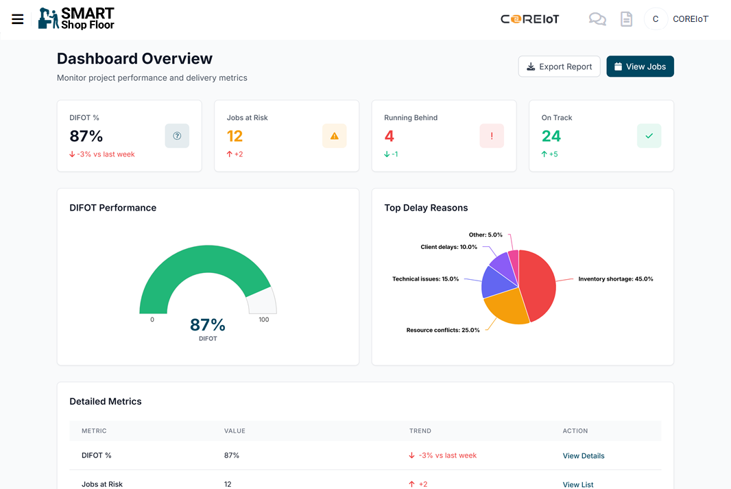 - Monitor critical KPIs to prevent late deliveries and bottlenecks