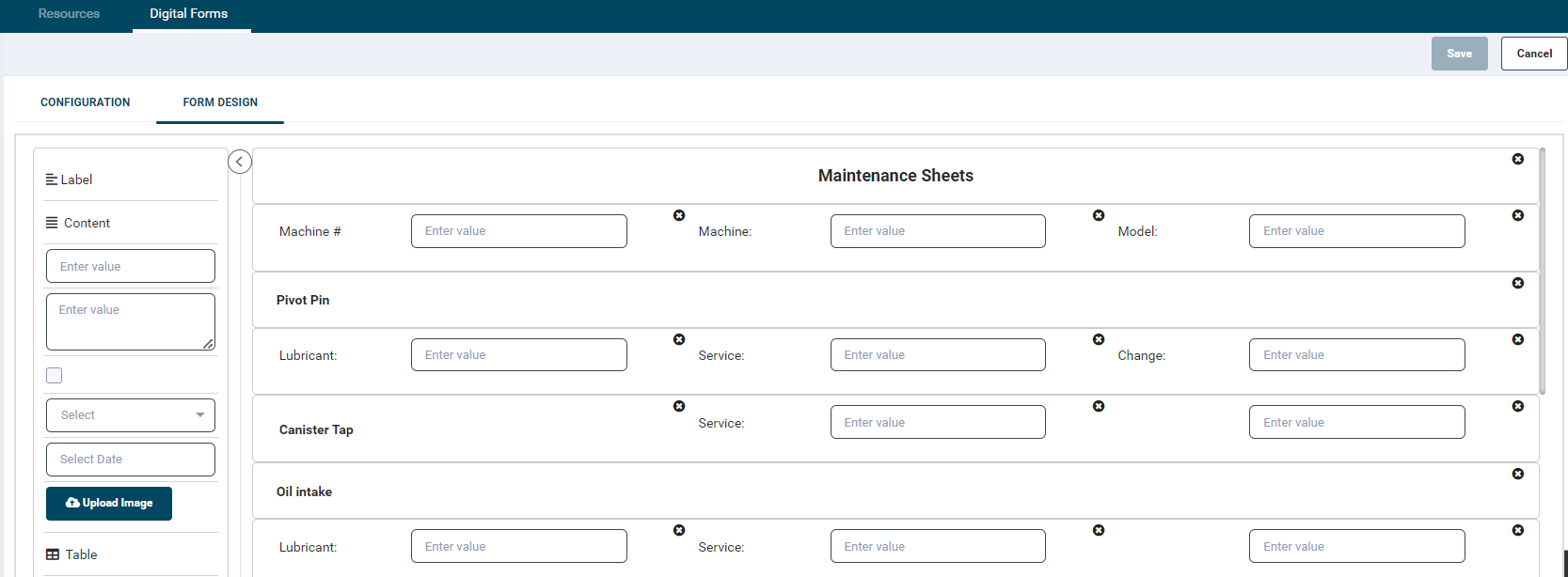 Pre-start or planned maintenance forms are linked to specific machines or work areas, creating a recorded maintenance history for troubleshooting and compliance.