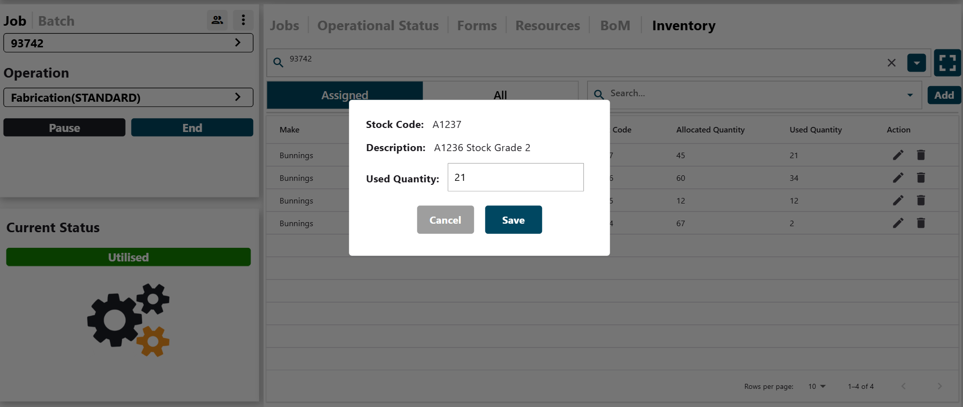 Operators see exactly which materials are assigned to their current job. They can update quantities used with a single tap, keeping stock levels accurate in real time.