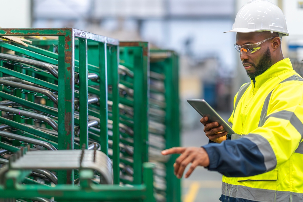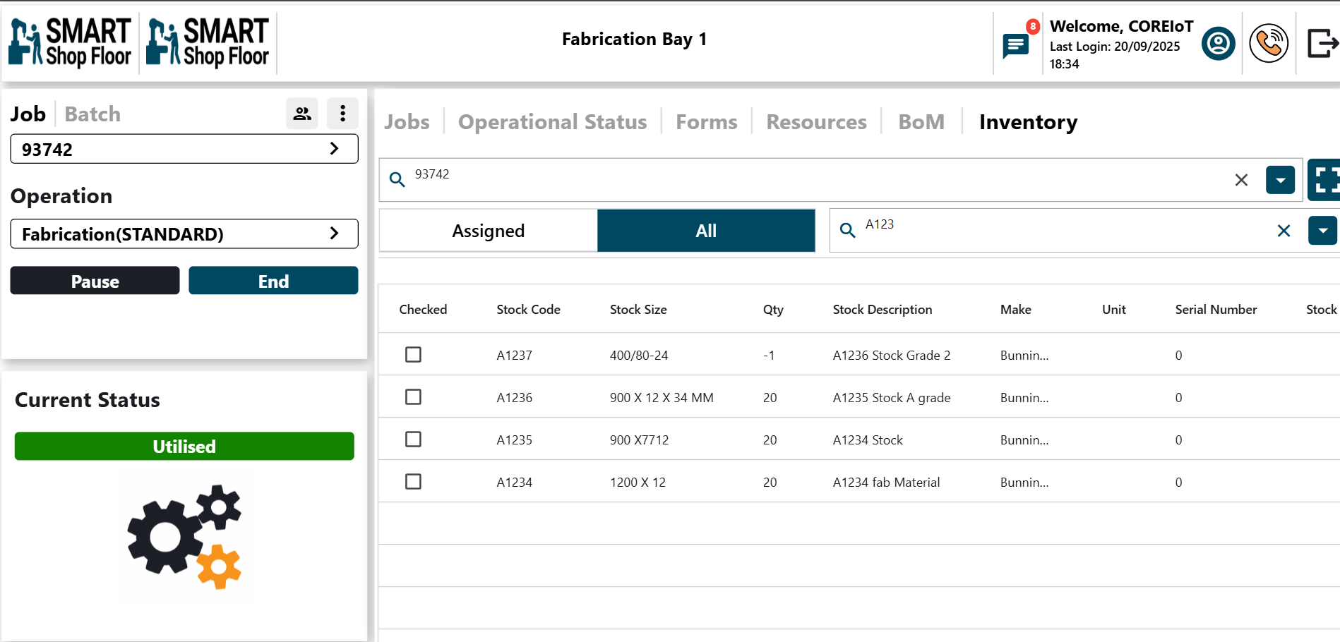 Browse your complete inventory from the tablet. Search, filter and check stock levels without leaving the shop floor — everything your operators need in one place.